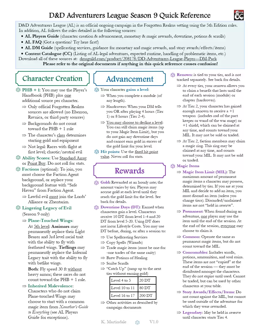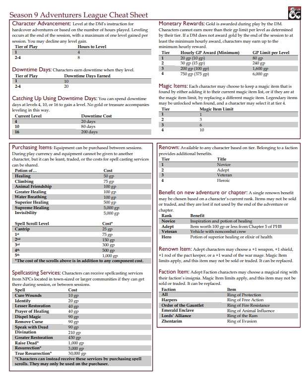Adventurers League Cheat Sheet Season 9 Dungeon Masters Guild