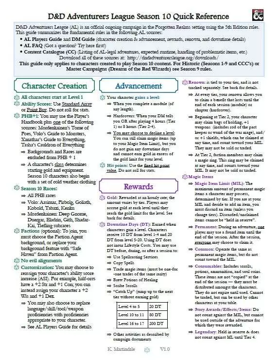 Adventurers League Season 10 Quick Reference Dungeon Masters Guild