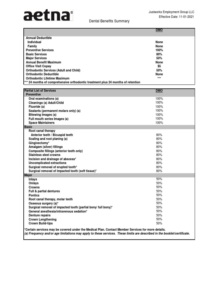 2021 2022 Aetna Justworks Dental Dmo Benefit Summary PDF Human