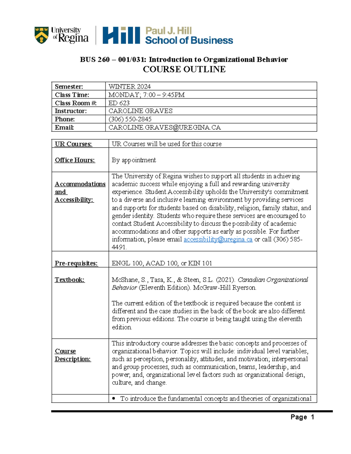 BUS 260 Course Outline Winter 2024 BUS 260 001/031
