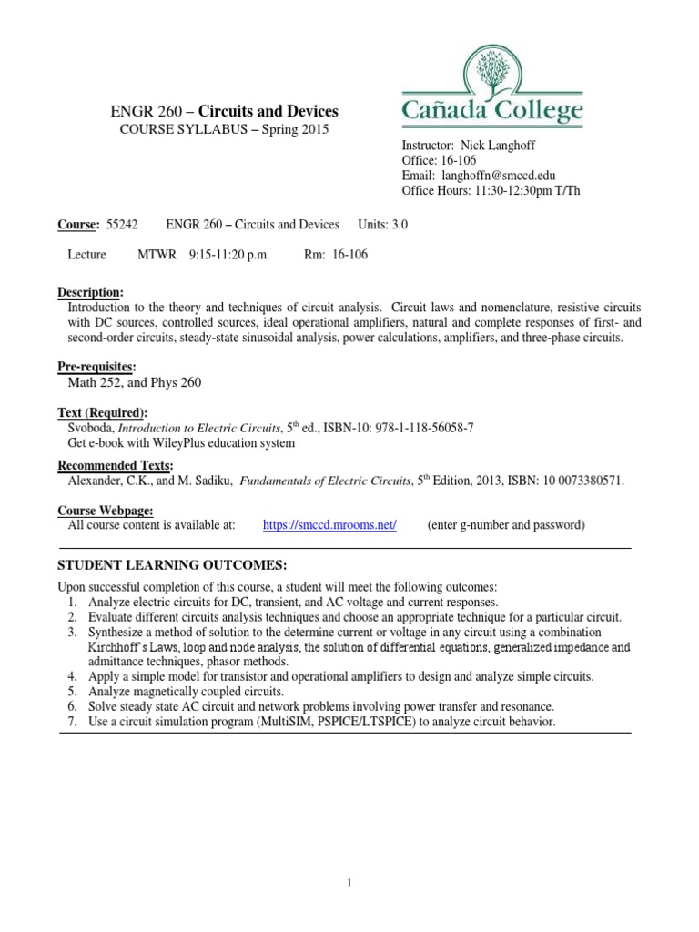 ENGR 260 Circuits and Devices COURSE SYLLABUS Spring 2015 PDF