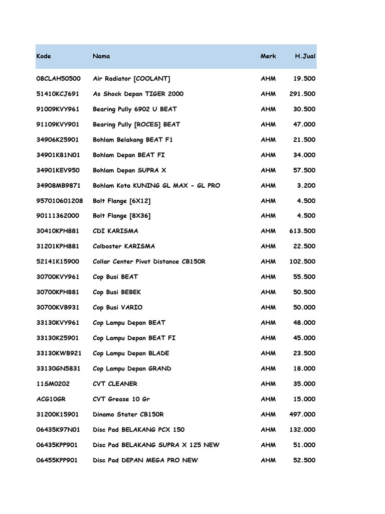 List Stock AHM 08 Jan 2024 PDF Mechanical Engineering Vehicle Parts