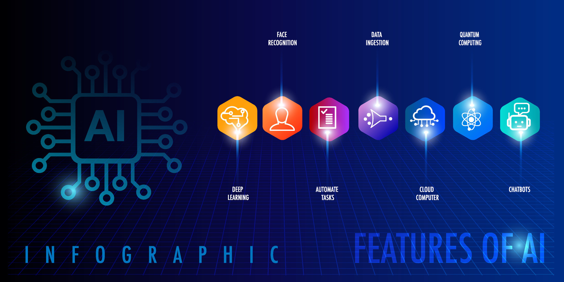7 Features of Artificial Intelligence infographic template with icon