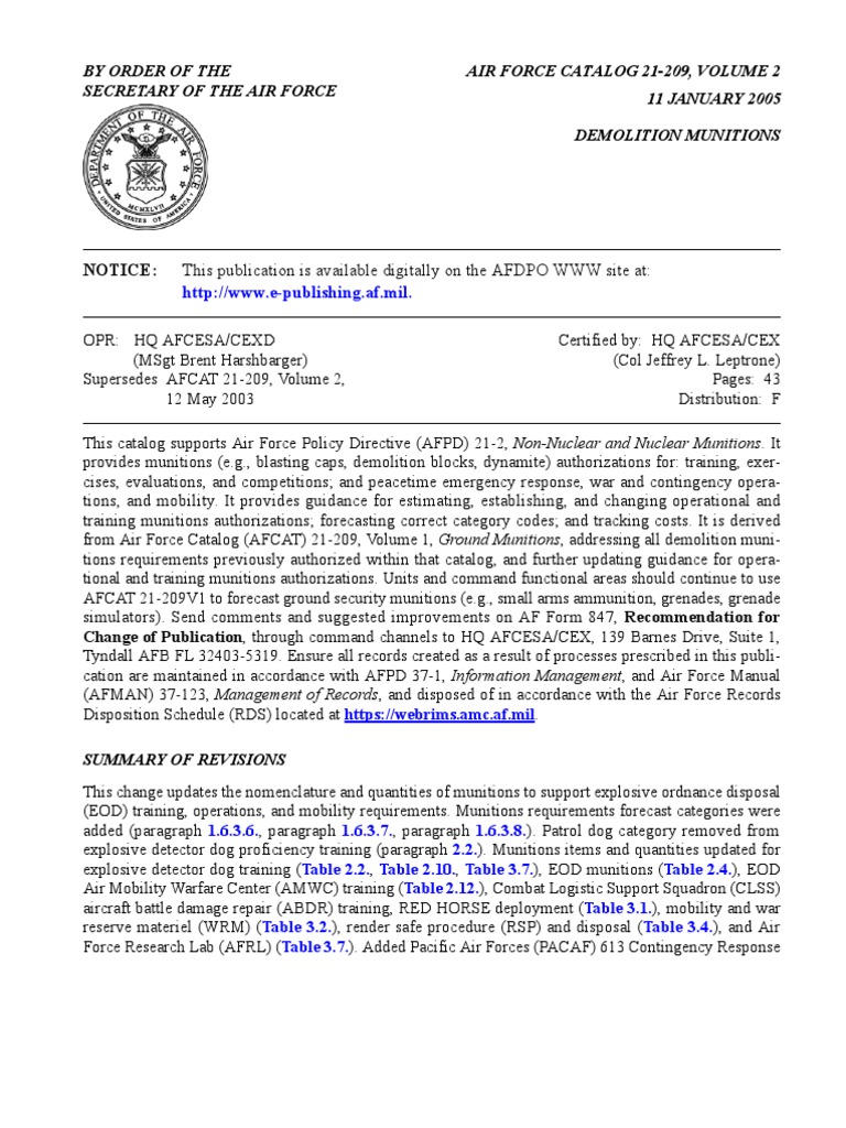 Air Force Catalog 21209, Volume 2afcat21209v2 PDF Bomb Disposal