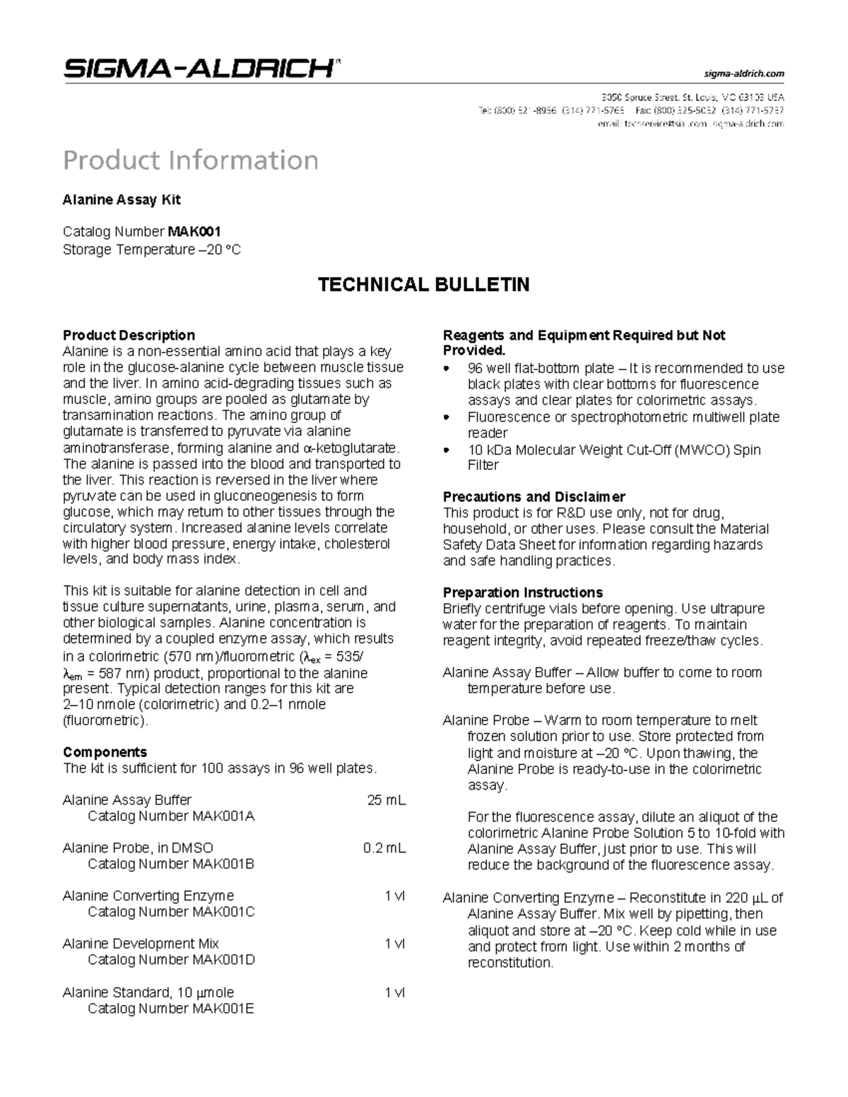 Alanins essay kit sigma aldrich Alanine Assay Kit Catalog Number MAK