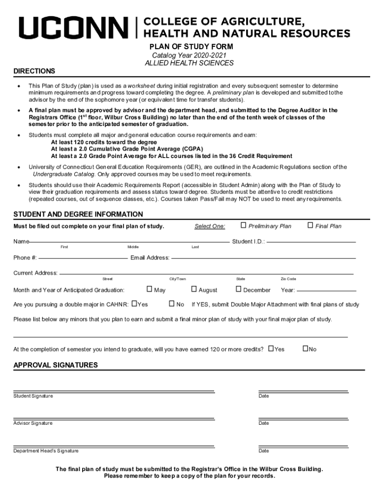 Fillable Online grow uconn PLAN OF STUDY FORM Catalog Year 20202021