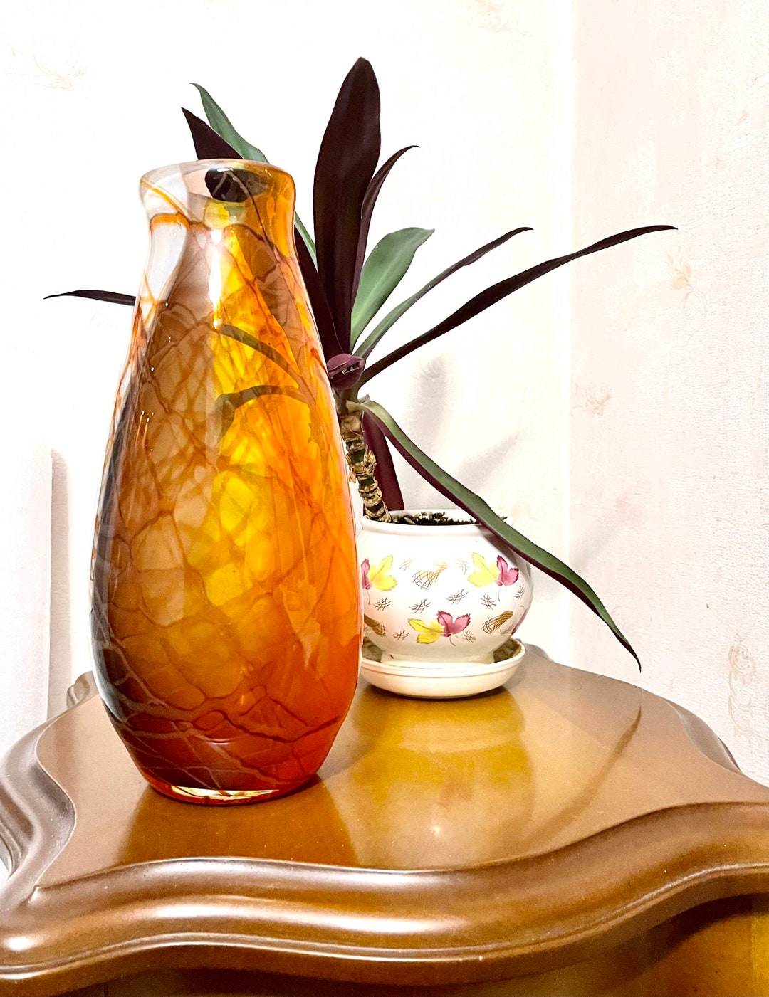 Ámbar w / White Vintage Retro Czech Flower Glass Art Vase Bowl Etsy