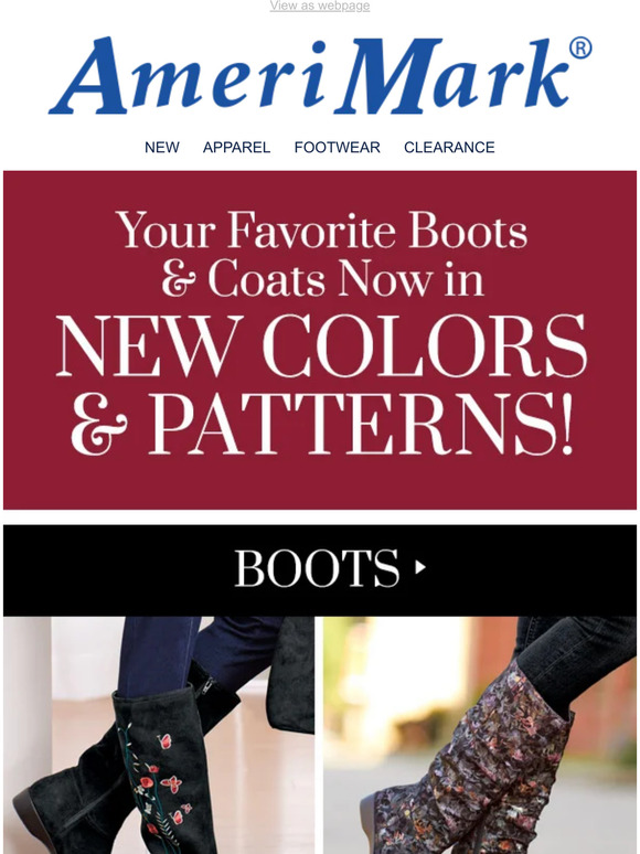 AmeriMark Your Favorite Boots & Coats now in NEW Colors and Patterns