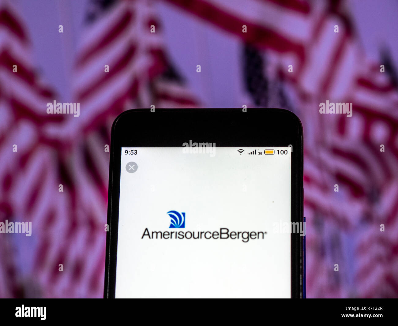 Flying Flag with AmerisourceBergen Logo, Closeup. Editorial 3D