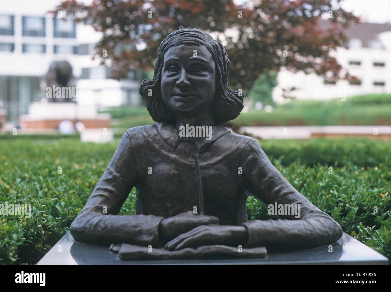 London. Lifesize bronze bust of Anne Frank in the courtyard of the