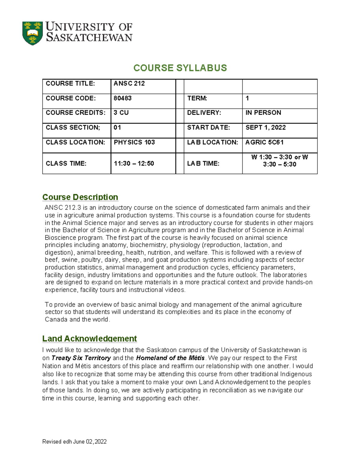 ANSC 212 Syllabus1 Syllabus for ANSC 212 Fall term 2022 Revised