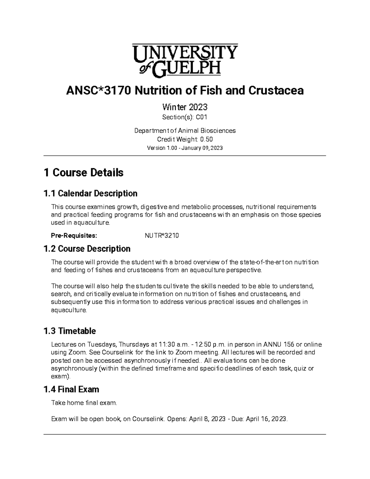 Ansc 3170 Course Outline W23 ANSC*3170 Nutrition of Fish and