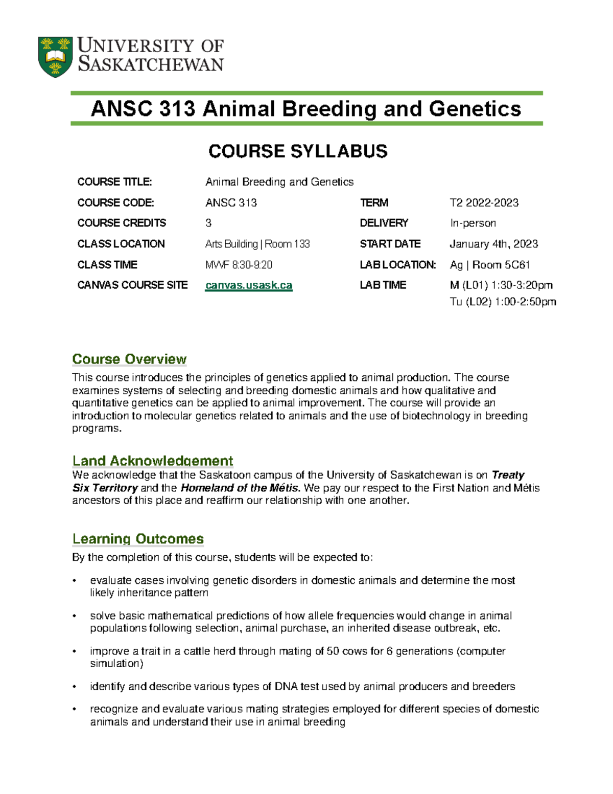 ANSC313syllabus Winter 2023 draft 1 ANSC 313 Animal Breeding and