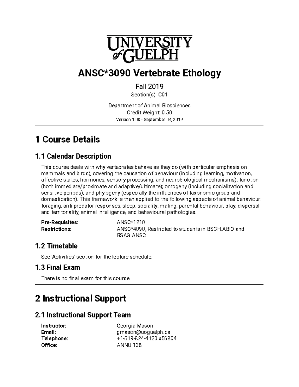 Ansc 3090 f19 mason Course Outline ANSC*3090 Vertebrate Ethology