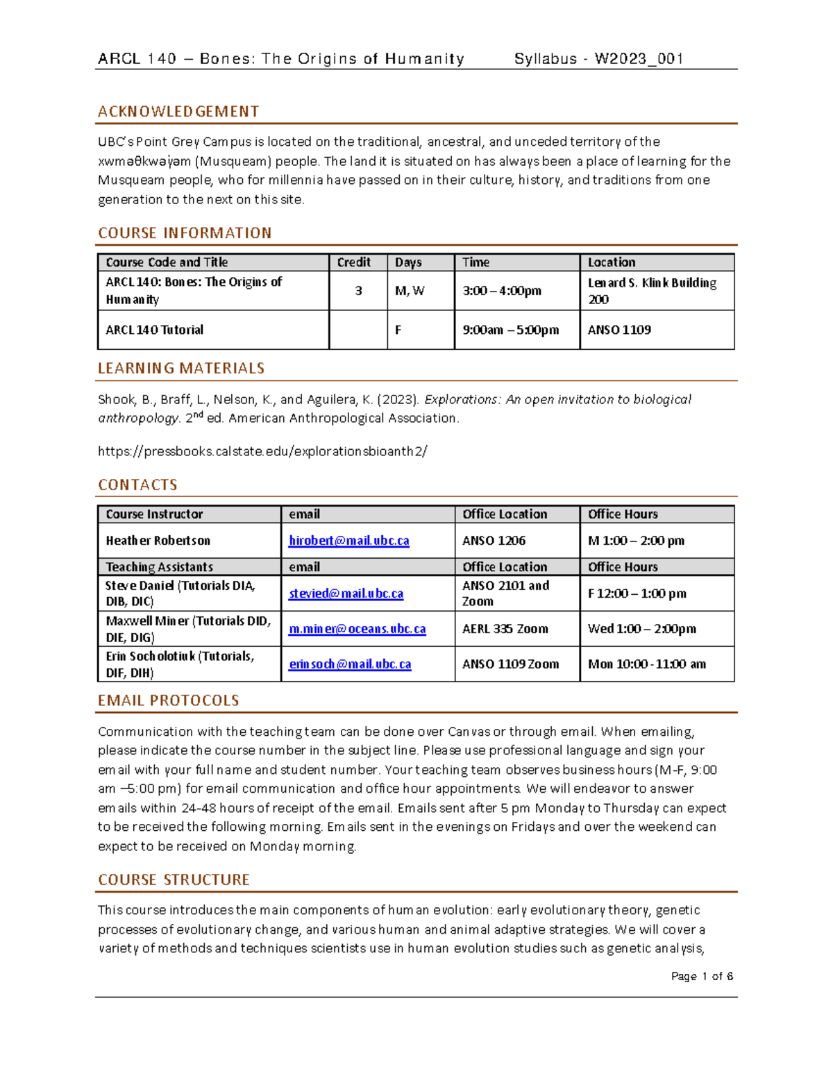 ANTH 140 Course Outline W 2023 ACKNOWLEDGEMENT UBC’s Point Grey
