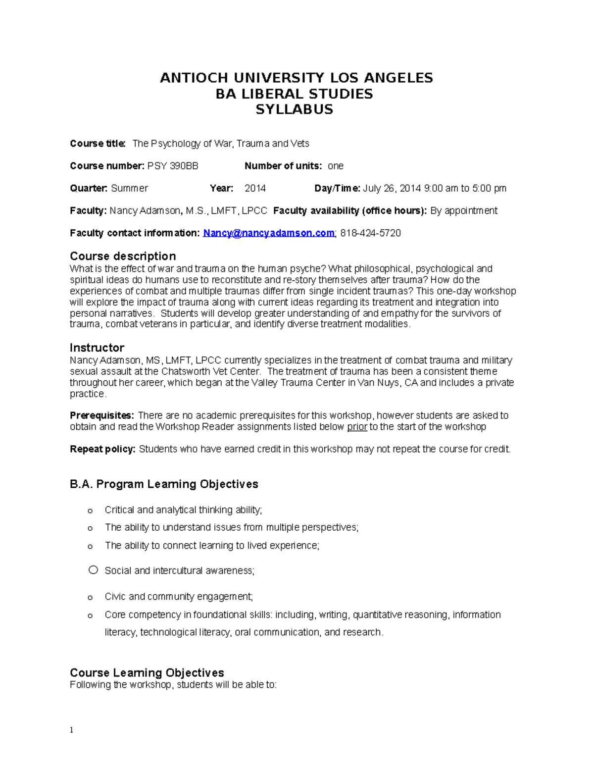 Adamson PSY390BB 2014 Syllabi for BA in Liberal Studies Course