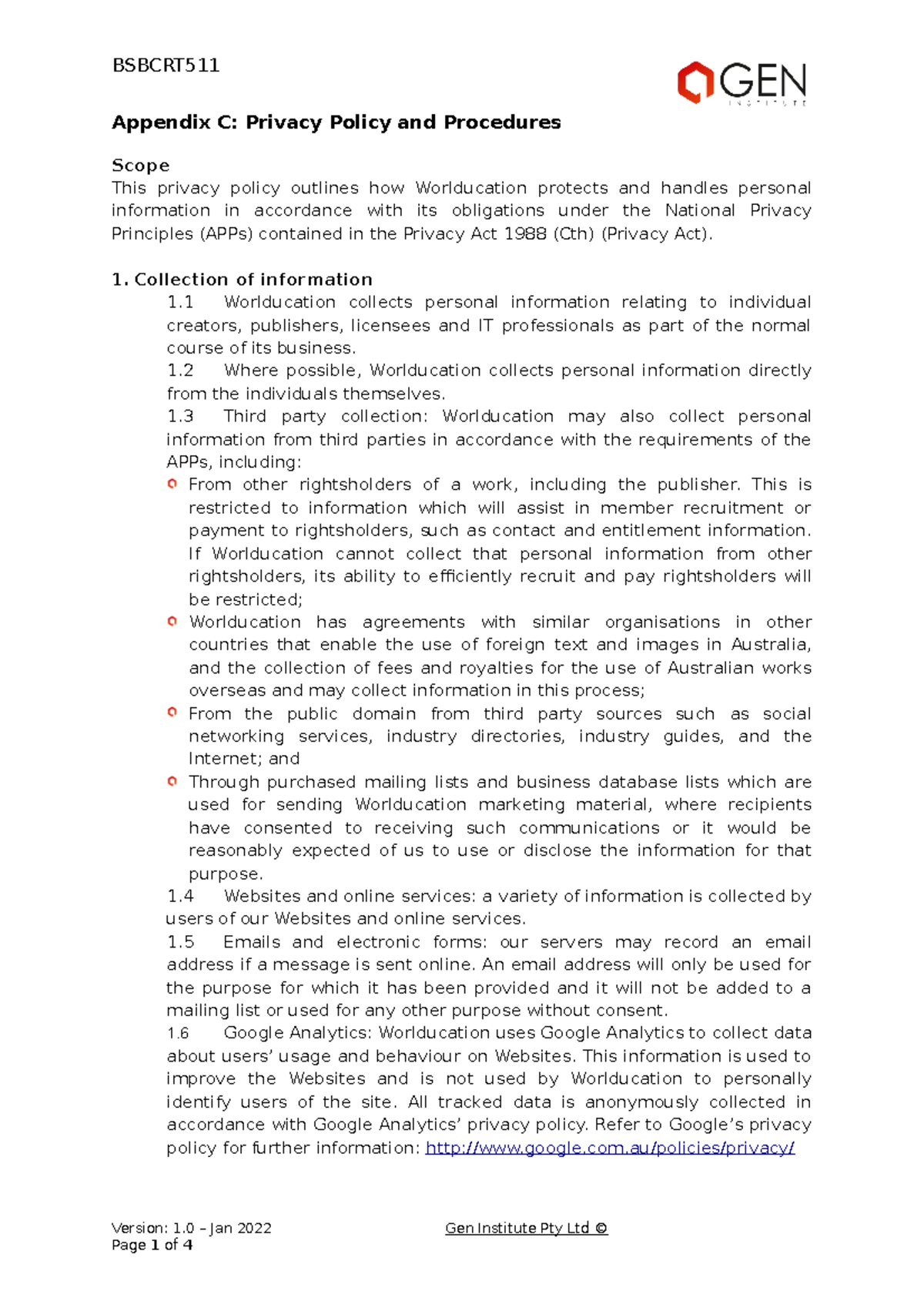 Appendix C Privacy Policy and Procedures Appendix C Privacy Policy