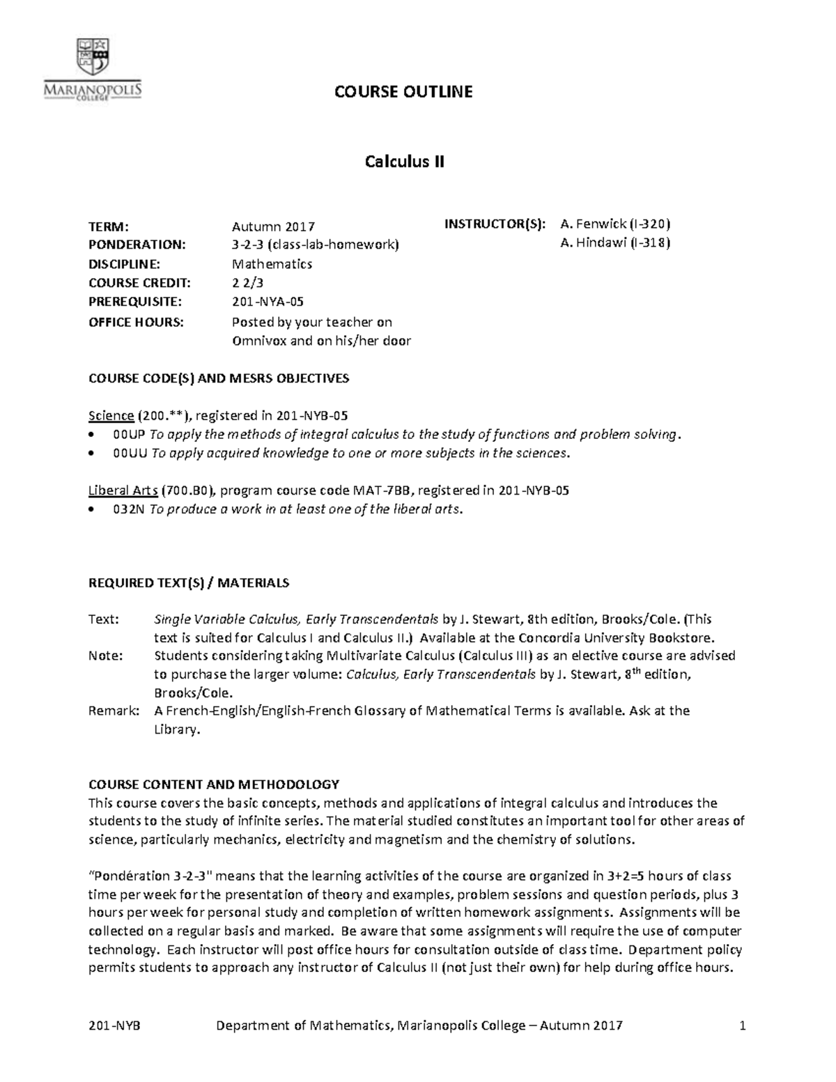 A17 201NYB Calculus II Science COURSE OUTLINE Calculus II COURSE