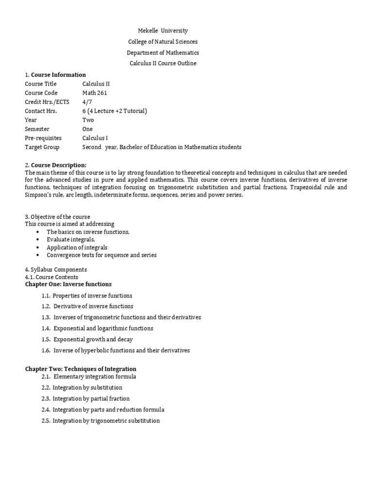 Calculus II Course Outline PDF Integral Function (Mathematics)