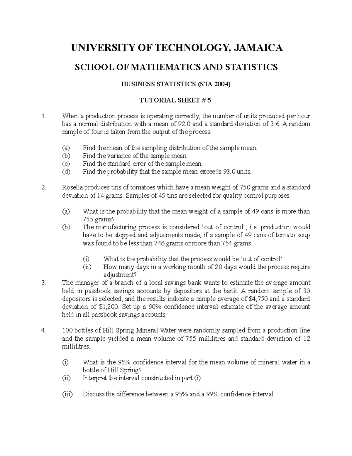 Tutorial Sheet 5 UNIVERSITY OF TECHNOLOGY, JAMAICA SCHOOL OF