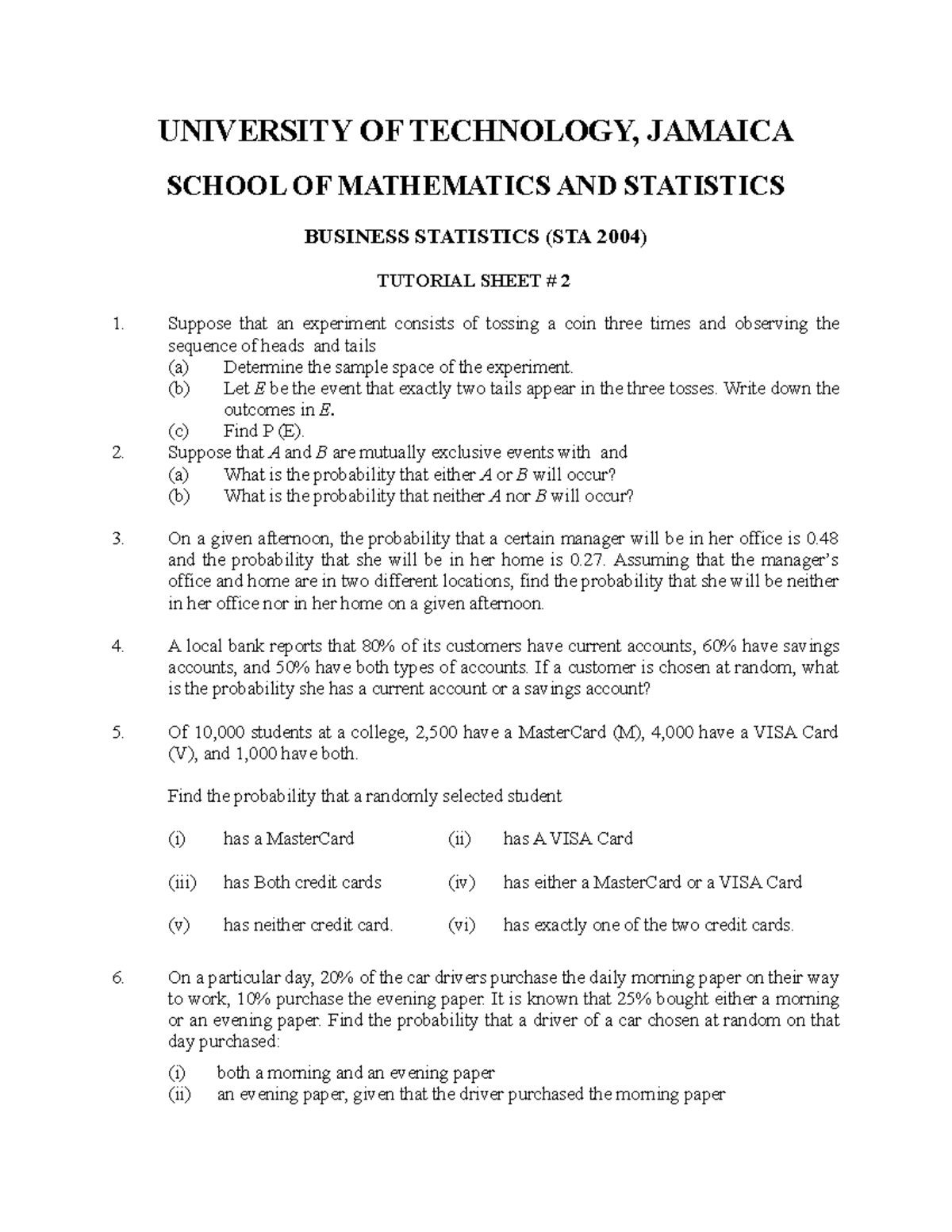 Tutorial Sheet2 UNIVERSITY OF TECHNOLOGY, JAMAICA SCHOOL OF