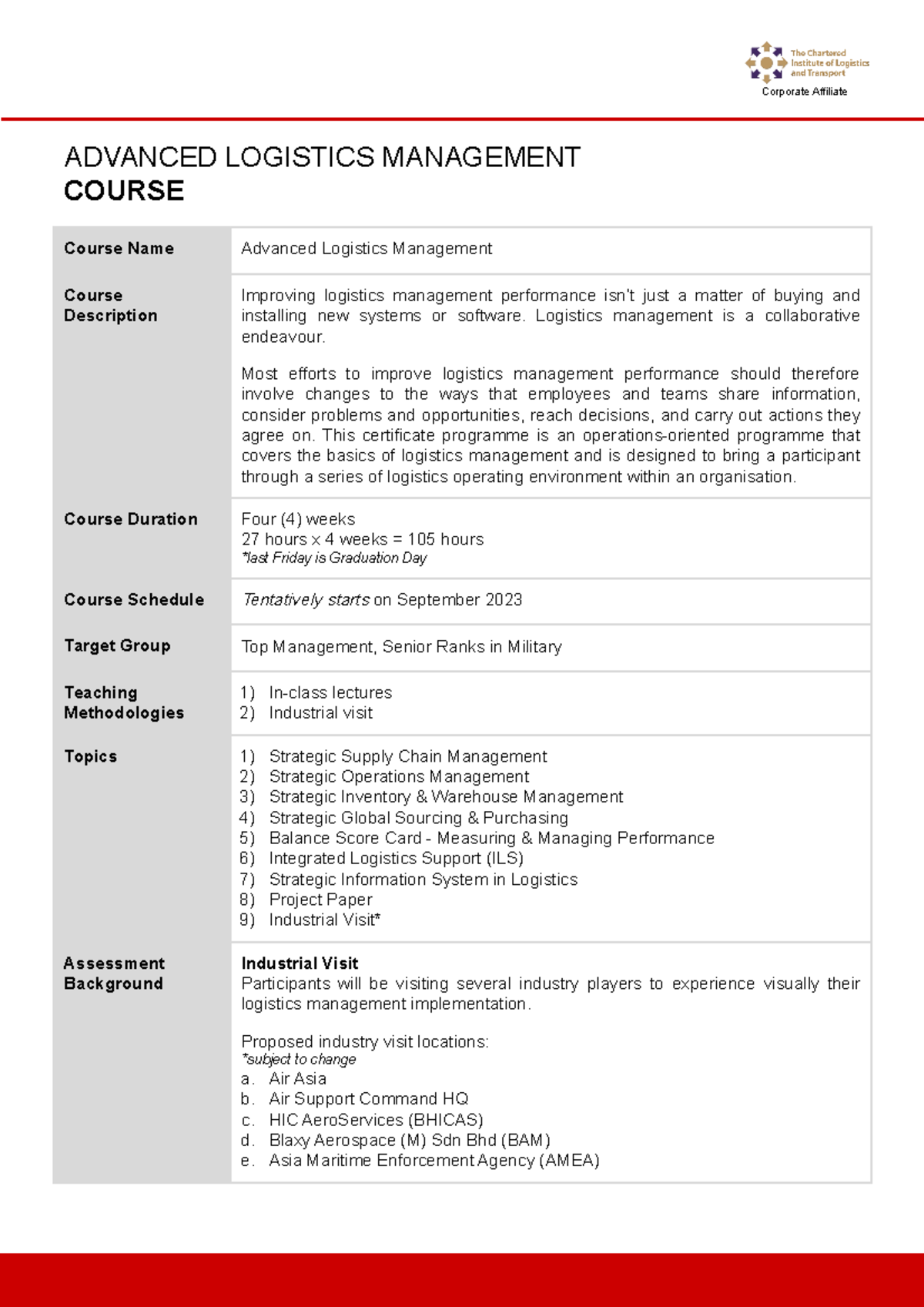 Course Outline (Advanced Logistics Management) ADVANCED LOGISTICS