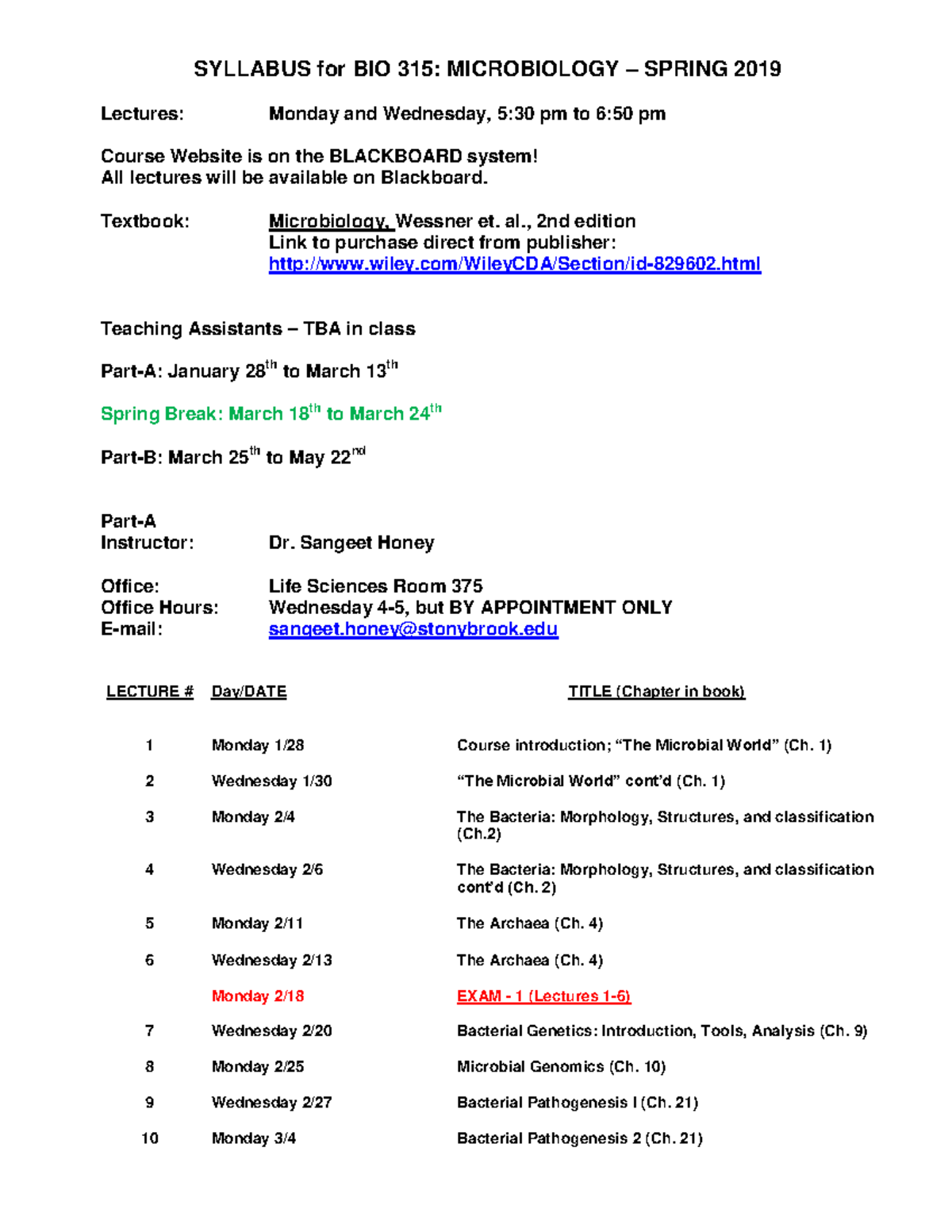 BIO 315 Syllabus spring 2019 SYLLABUS for BIO 315 MICROBIOLOGY