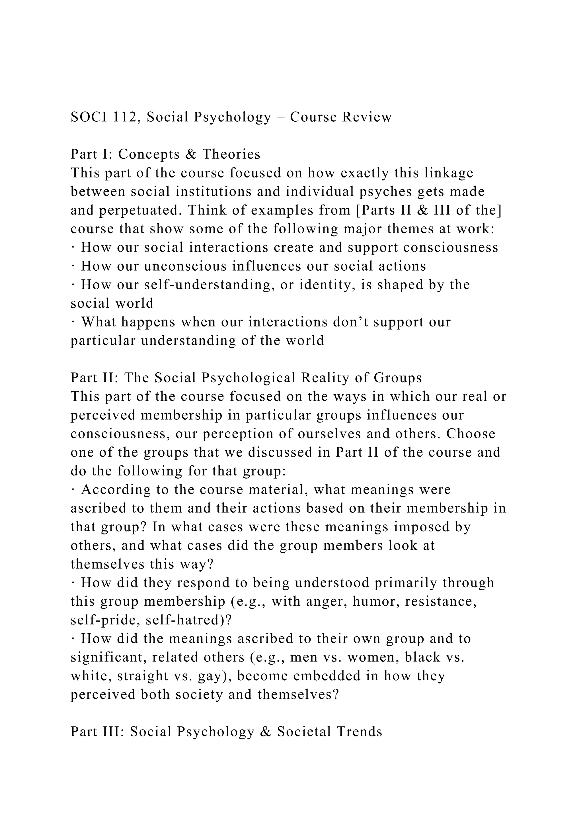 SOCI 112, Social Psychology Course Review Part I Concepts &.docx