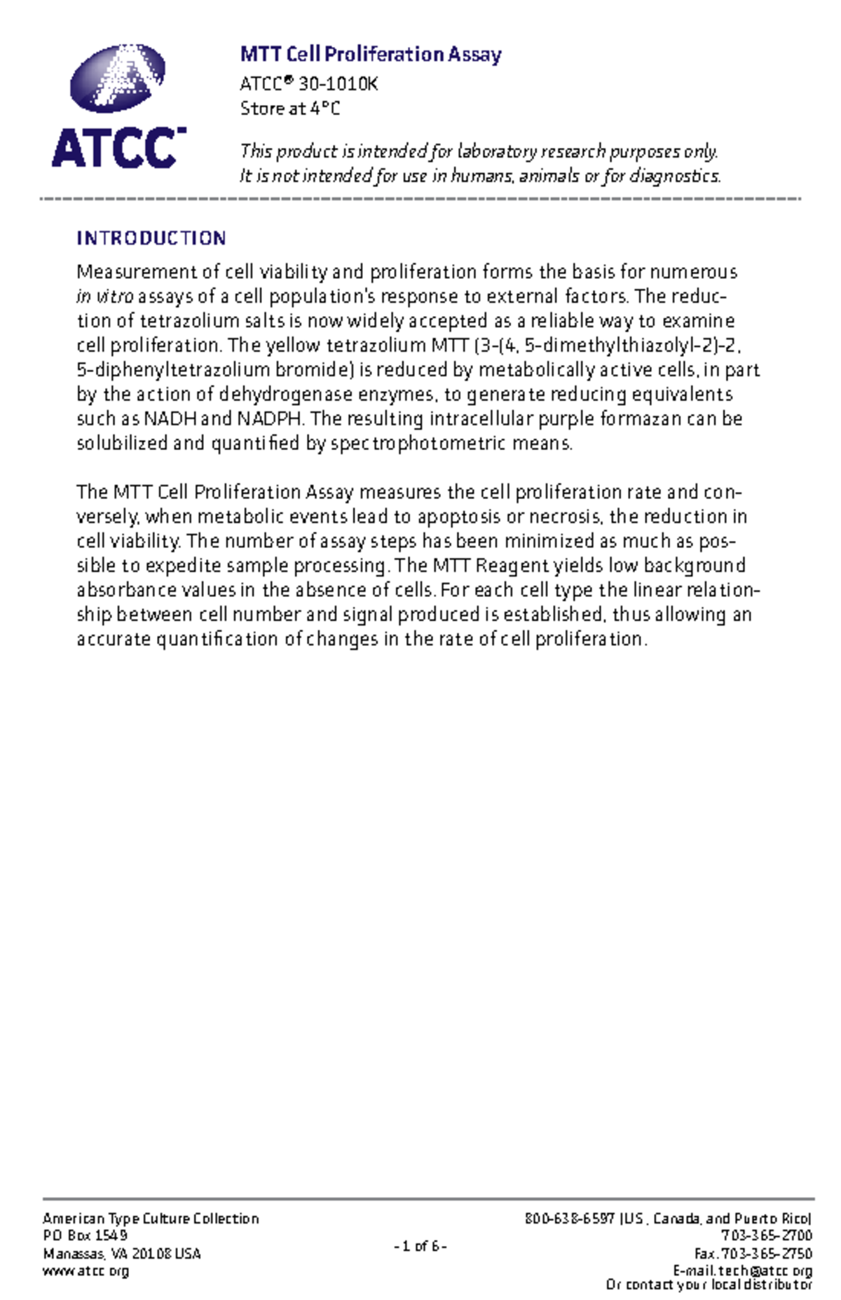 MTT Cell Proliferation Assay MTT Cell Proliferation Assay ATCC® 30