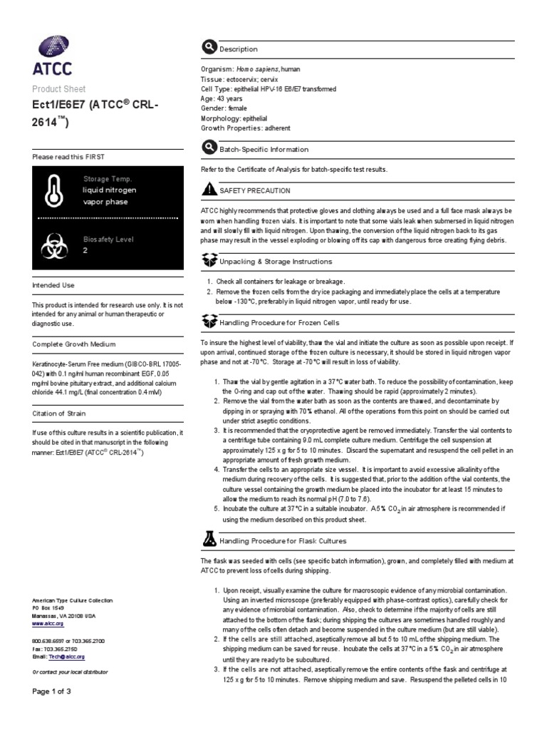 Ect1/E6E7 (ATCC CRL 2614) Product Sheet PDF Atcc