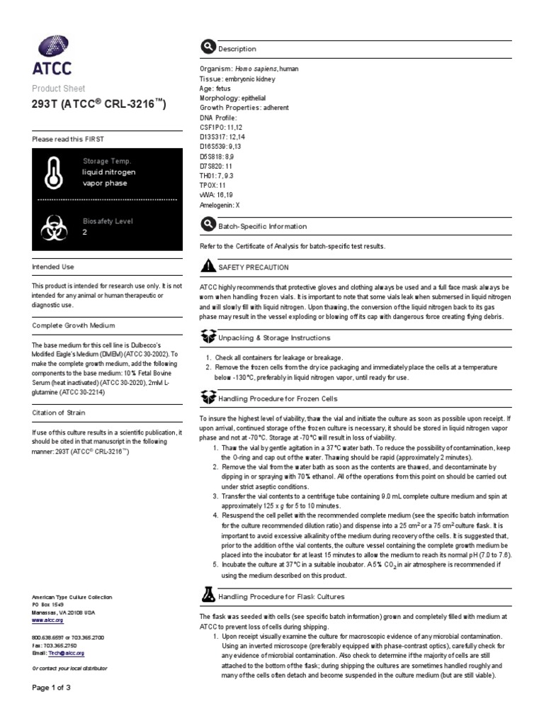 293T (ATCC CRL 3216) Product Sheet PDF Atcc Cell Culture