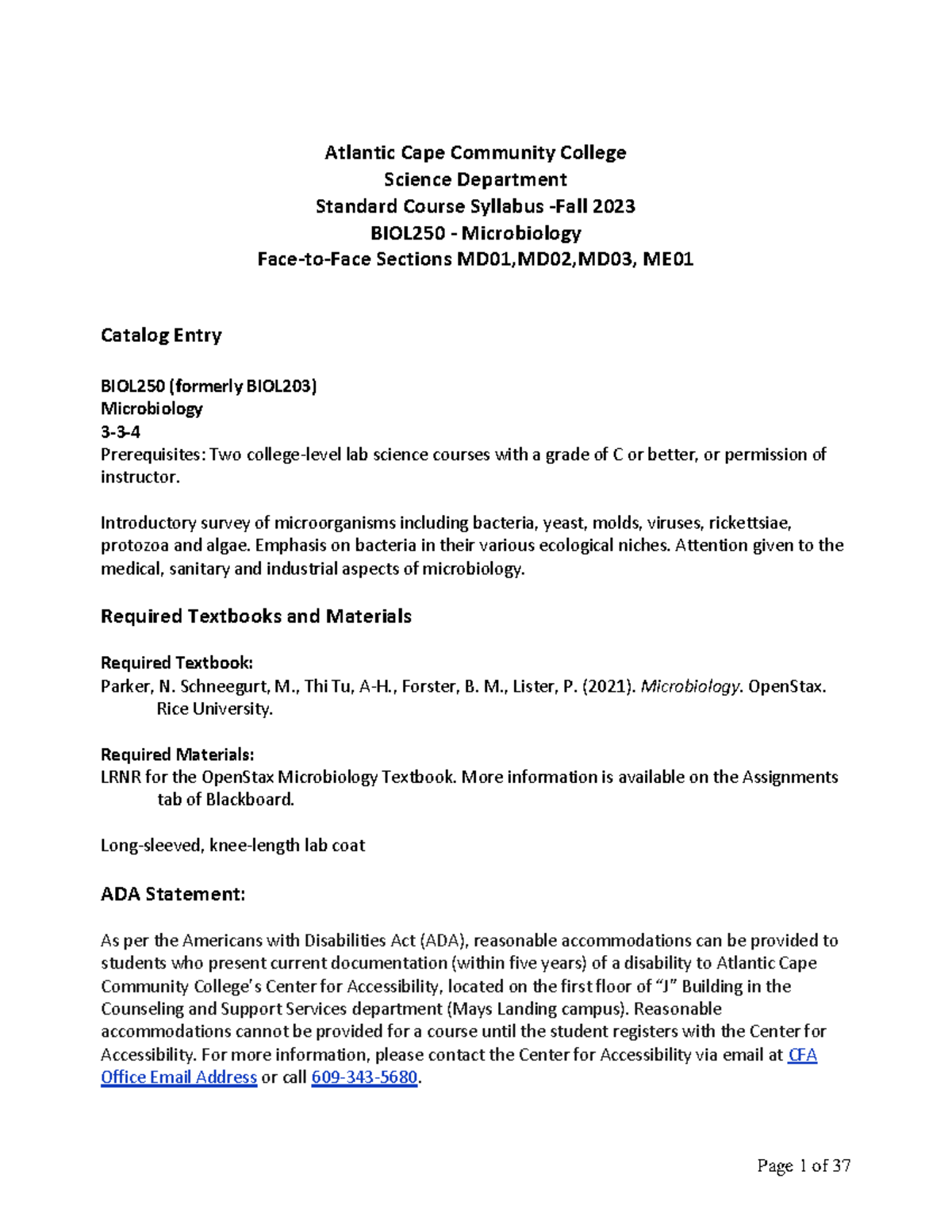 Course SyllabusFFFall 2023 Atlantic Cape Community College Science