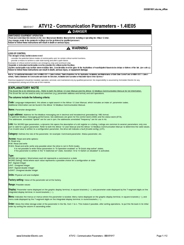 ATV12 Communication Parameters BBV51917 1.4IE05b PDF Integer