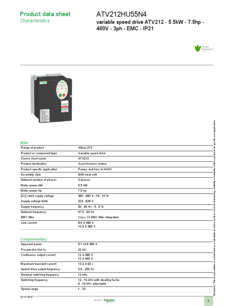 ATV212HU55N4 variable speed drive product data sheet PDF Electric