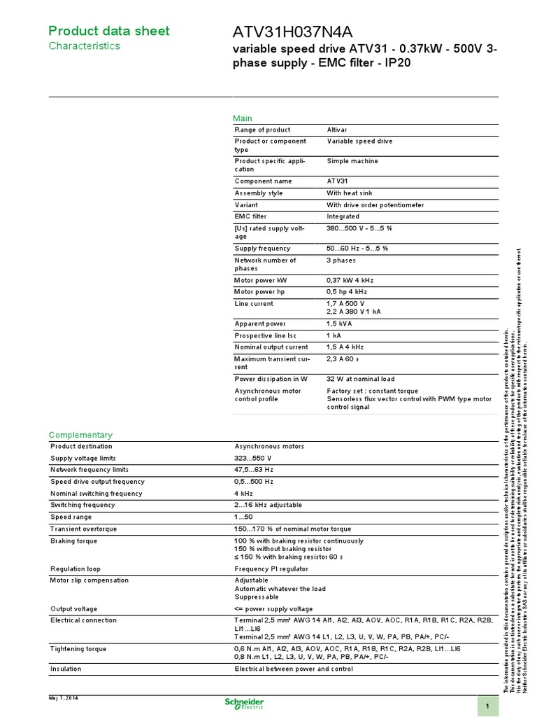 Product Data Sheet for ATV31 Variable Speed Drive with Technical