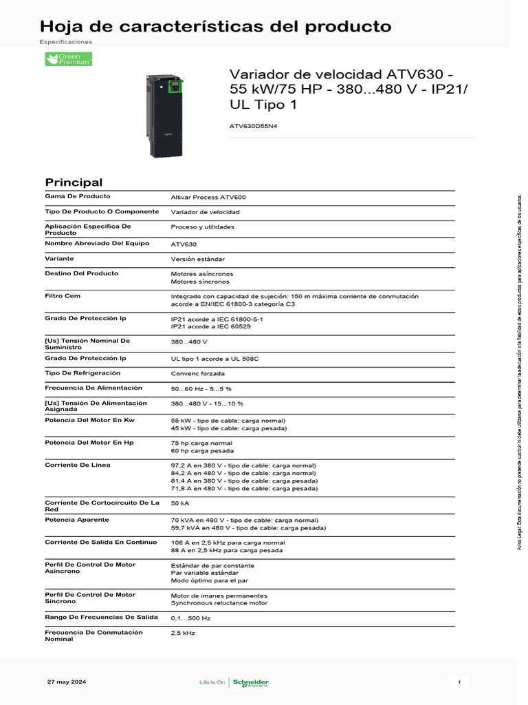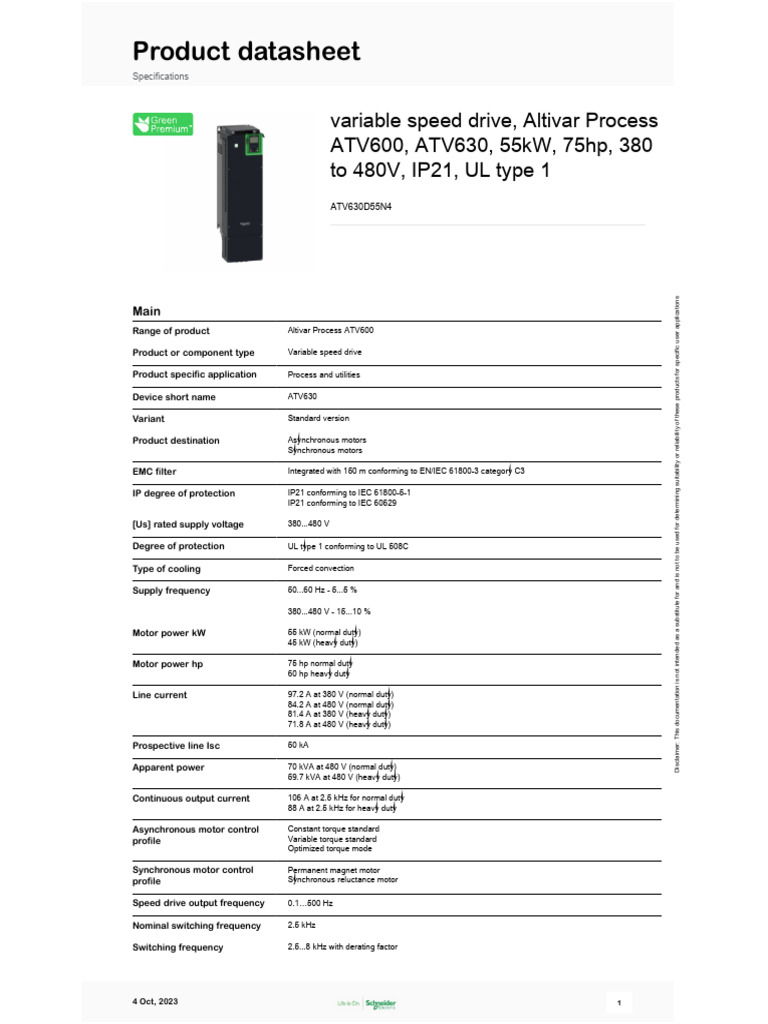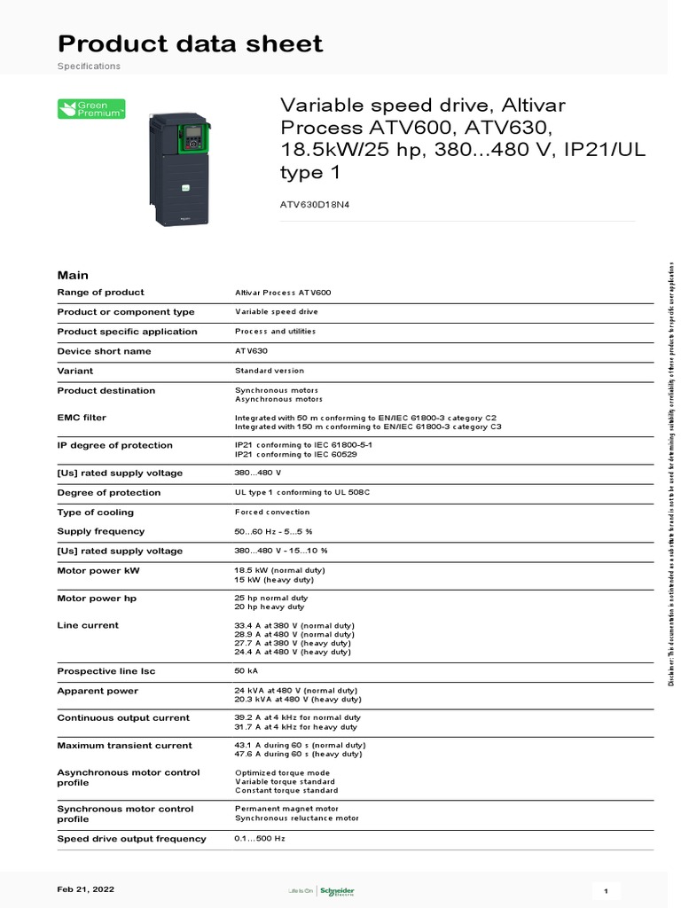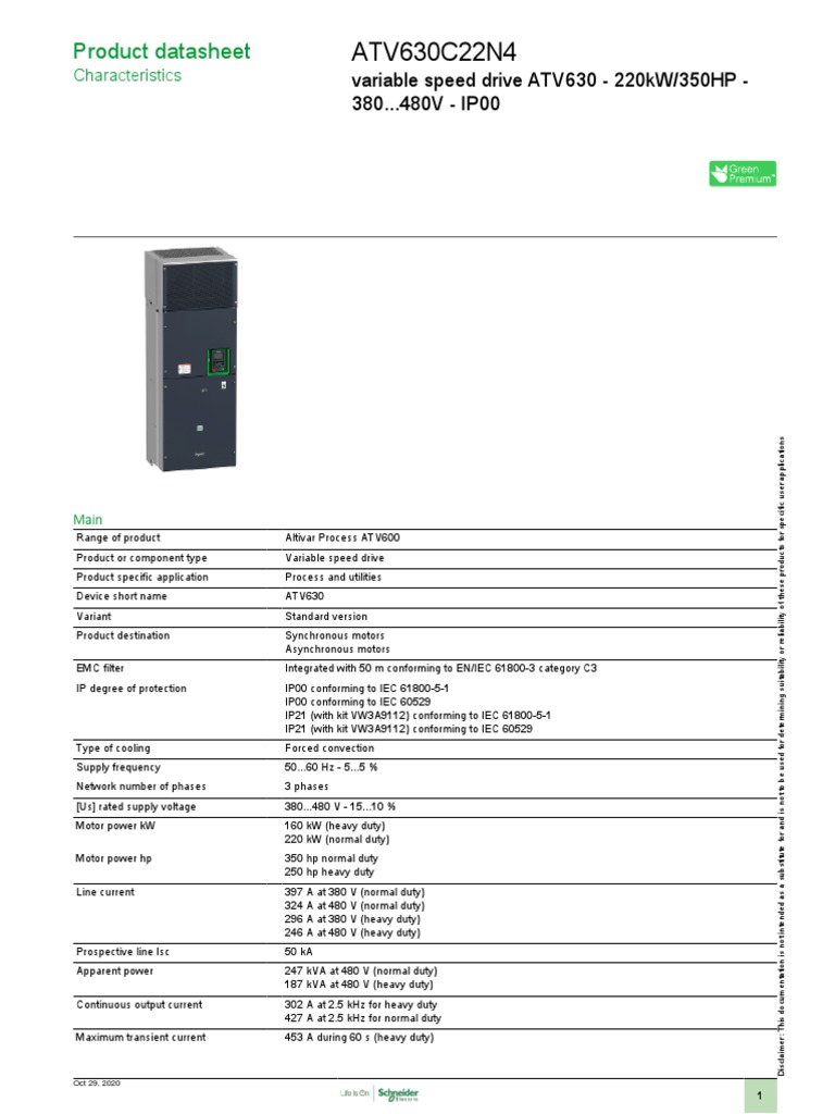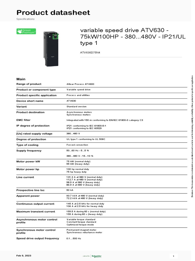 Variable Speed Drive, Altivar Process Atv600, Atv630, 90Kw/125 Hp, 500V