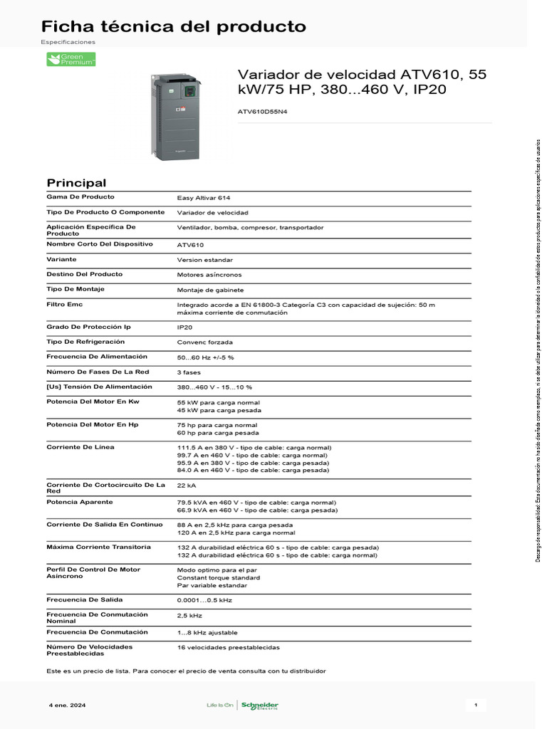 Schneider ATV610D75N4 ATV610, 75 KW 100 HP, 380...460 V, IP20, Three