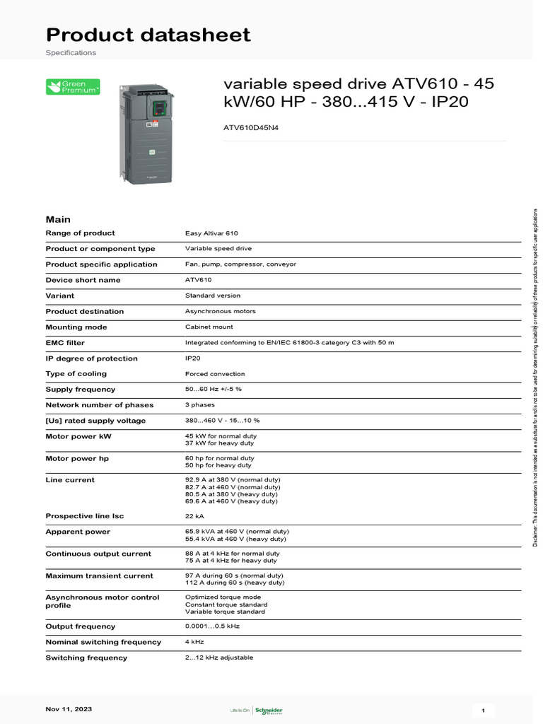 Promo Schneider Altivar ATV610 Variable Speed Drive 22kW 30HP