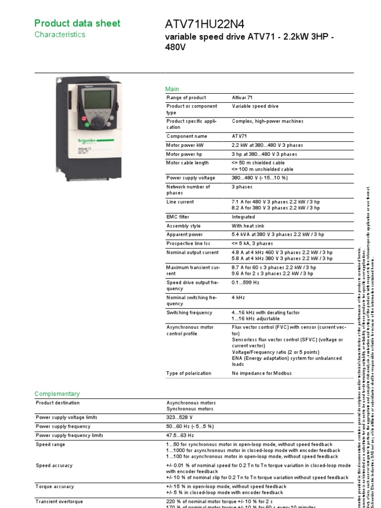 ATV71HU22N4Z variable speed drive ATV71 2.2kW3HP 480V EMC