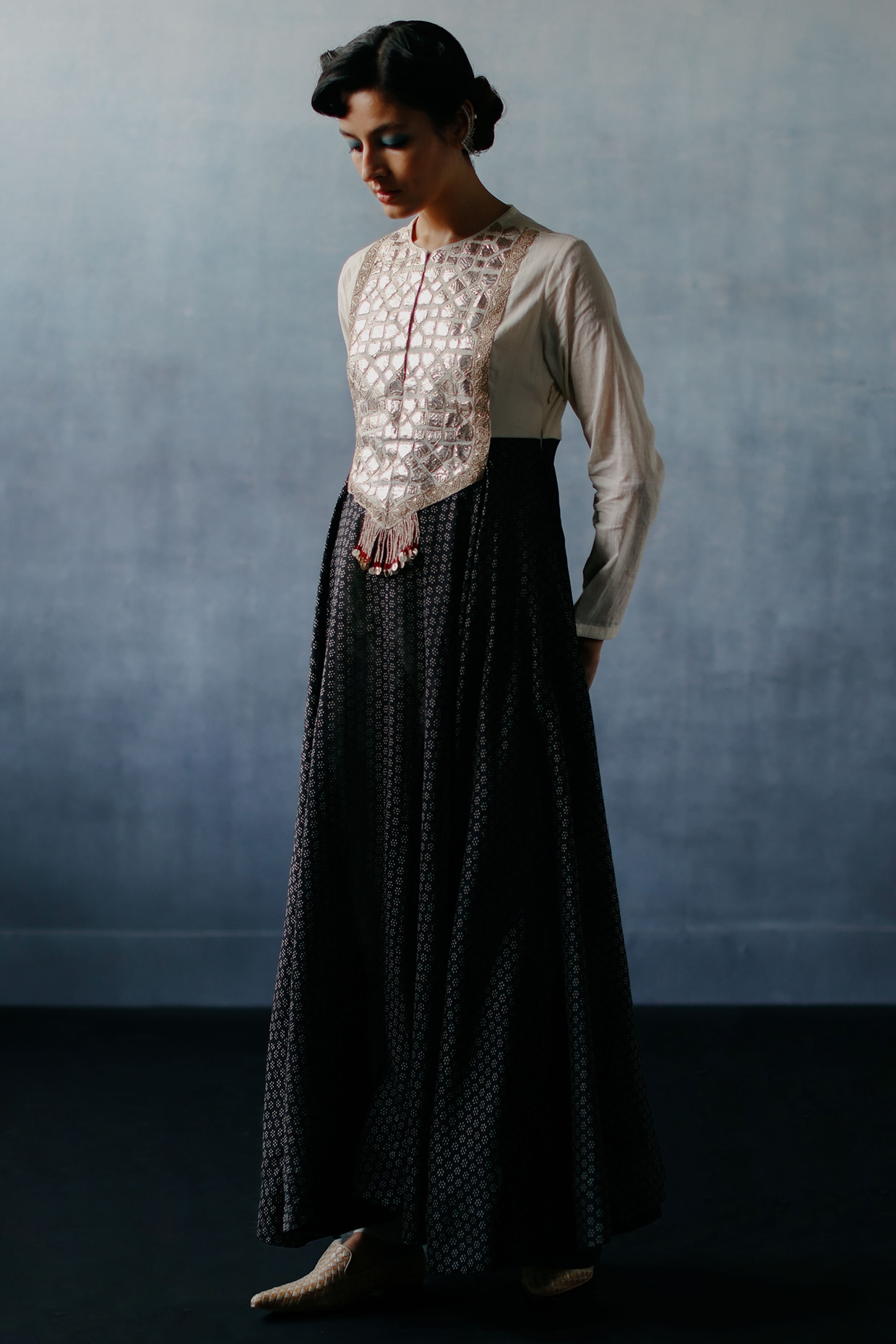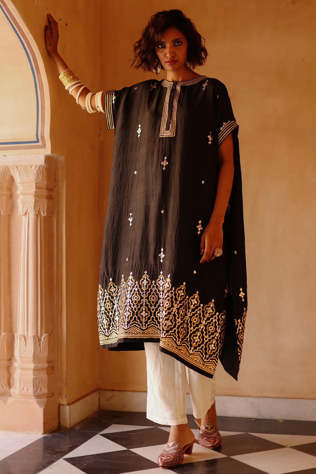 Black & White Handloom Muslin Cotton Gota & Marodi Work Kurta by