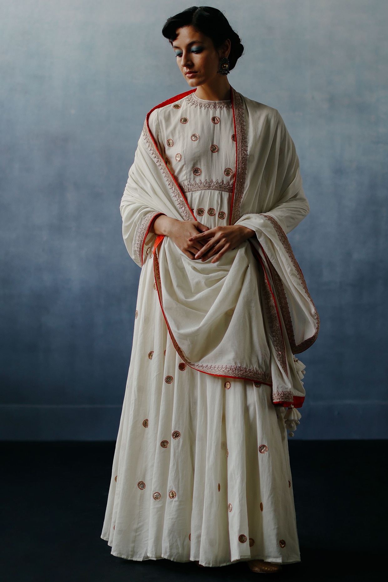 White Handloom Muslin Cotton Dori & Gota Work Anarkali Set by Avacara