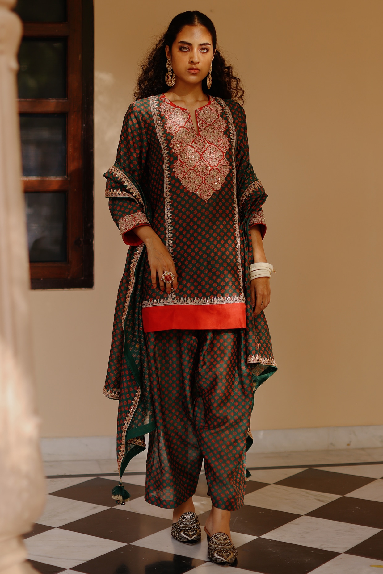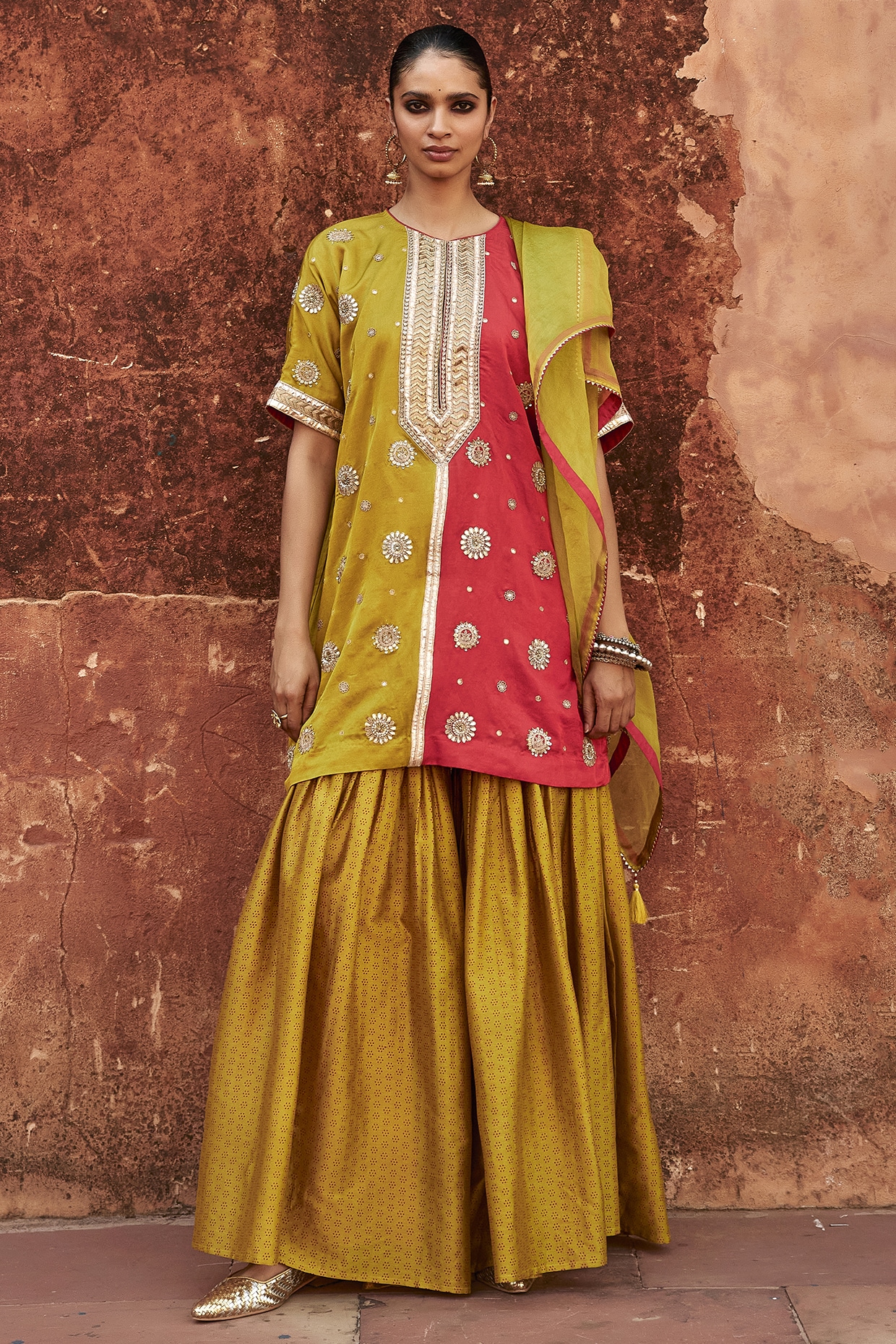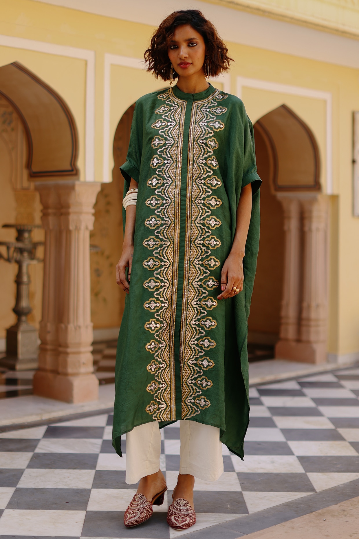 Green Pure Mulberry Silk Gota Work Kaftan Set by Avacara at Pernia's
