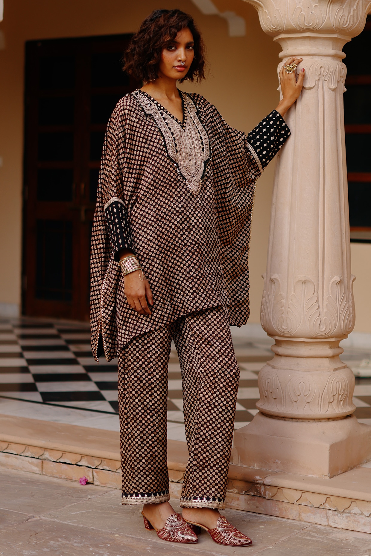 Black Pure Mulberry Silk Embroidered Kaftan Set by Avacara at Pernia's