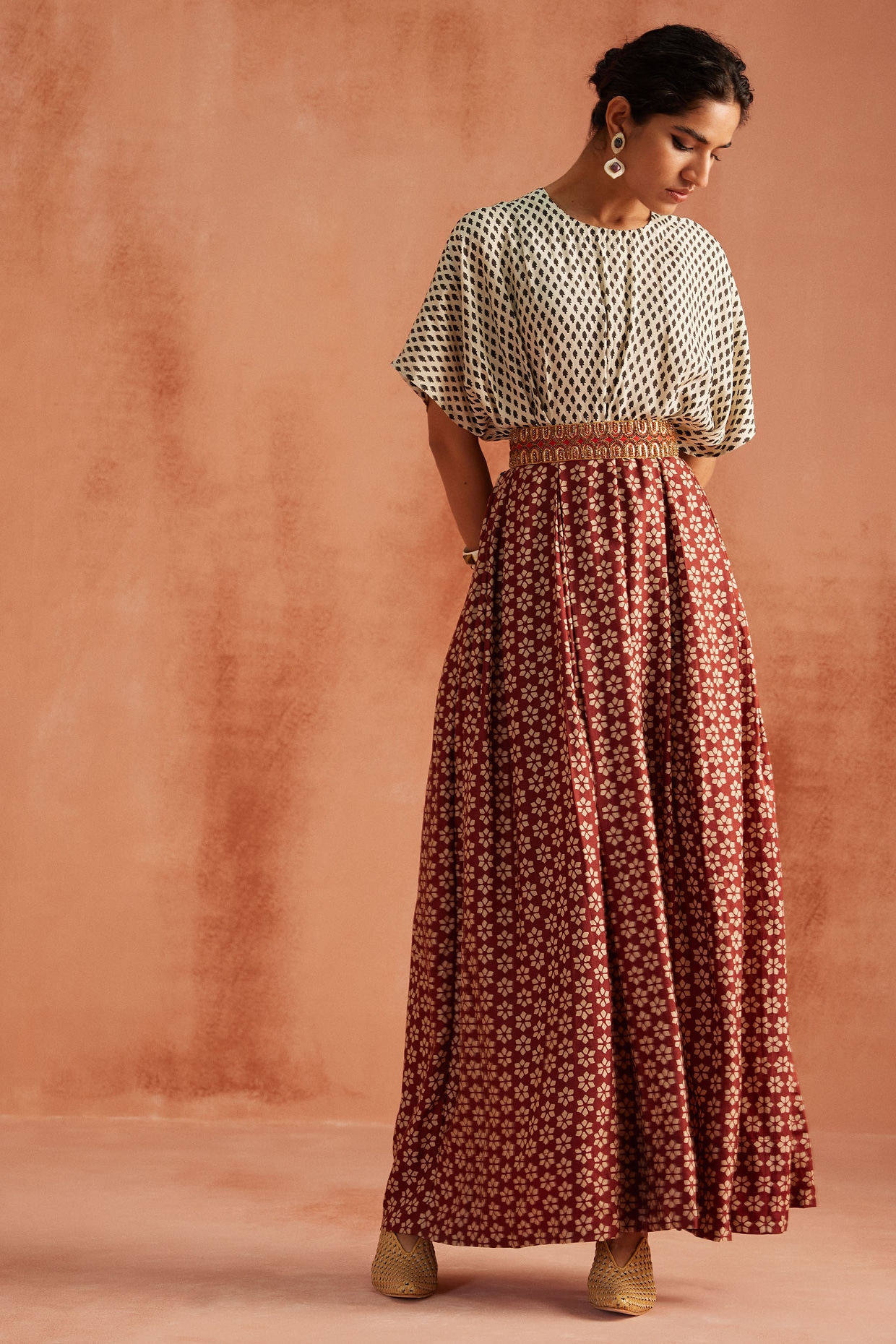 White & Black Cotton Silk Satin Hand Block Printed Kaftan Dress by