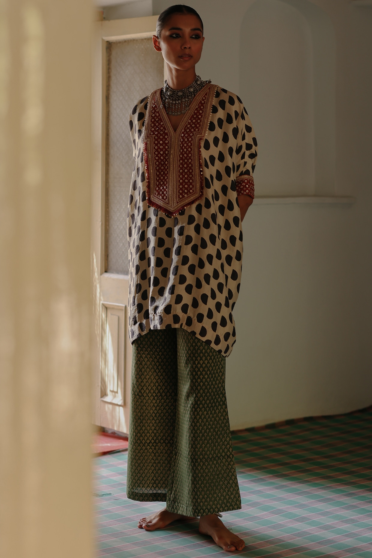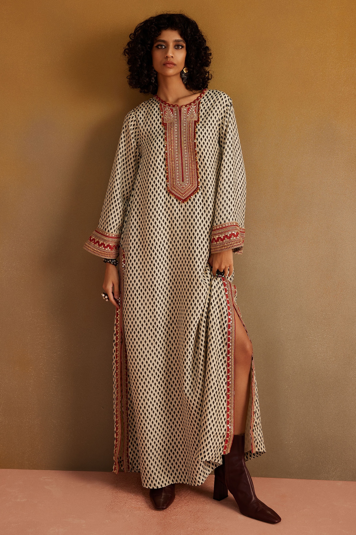 Cream Silk Printed & Resham Embroidered kaftan Set by Avacara at Pernia