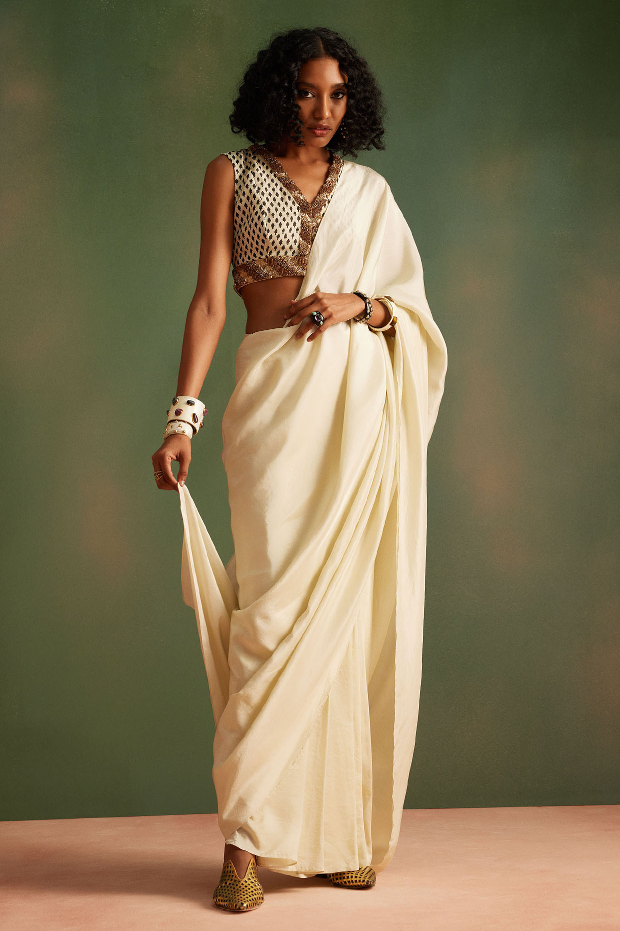 White Pure Silk PreDraped Saree Set by Avacara at Pernia's Pop Up Shop