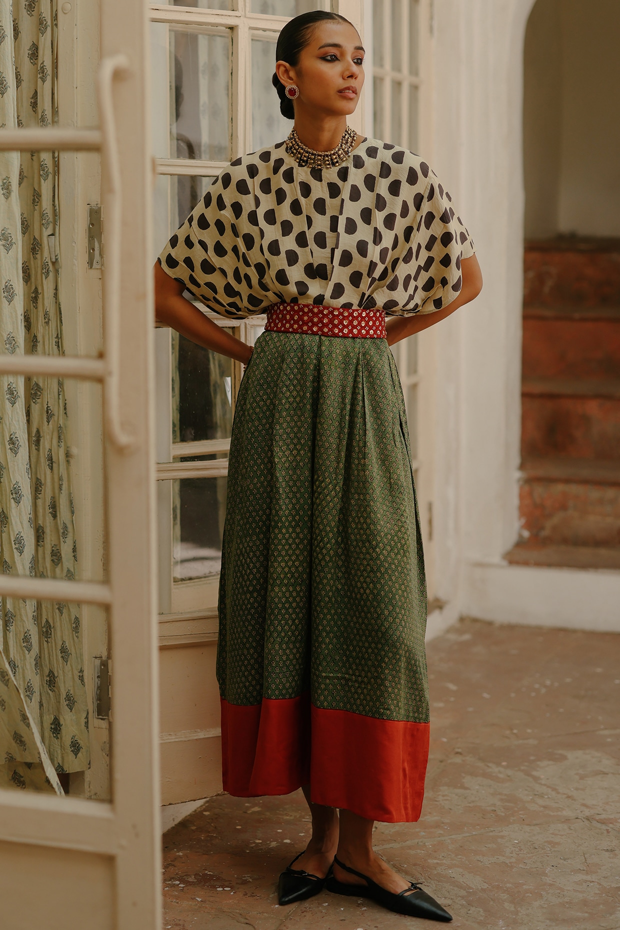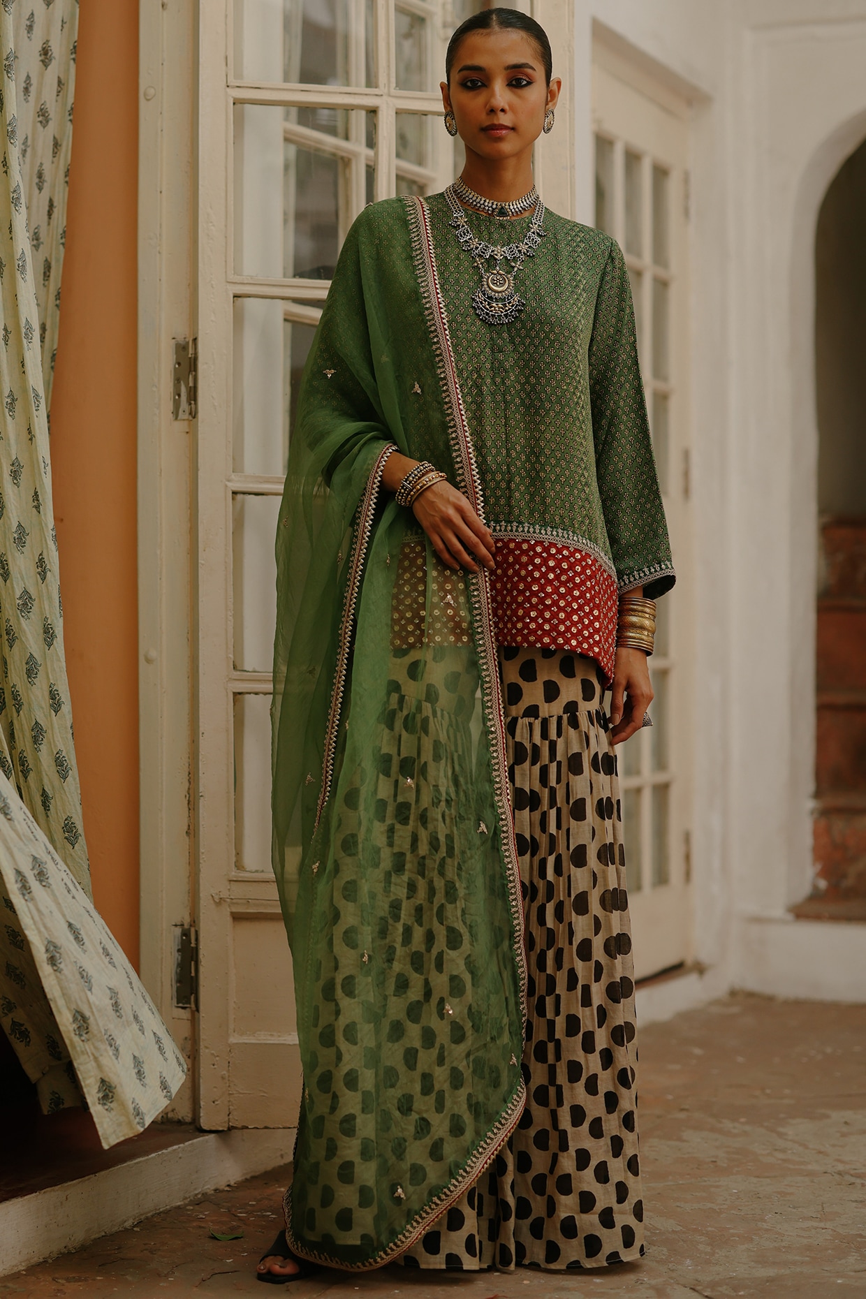 Green Chanderi Handblock Printed & Marodi Work Set by Avacara at Pernia
