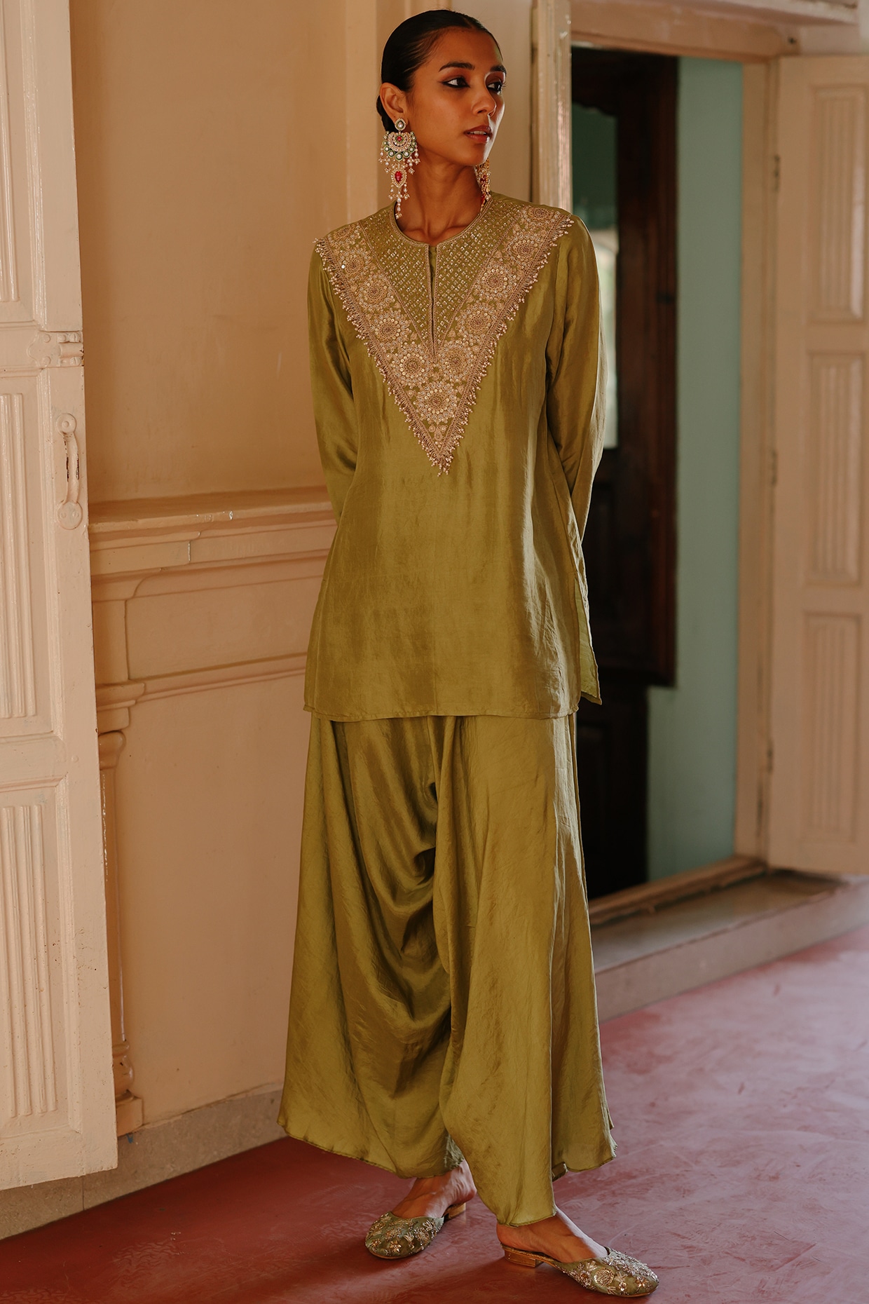 Olive Green Pure Silk Dori Work CoOrd Set by Avacara at Pernia's Pop