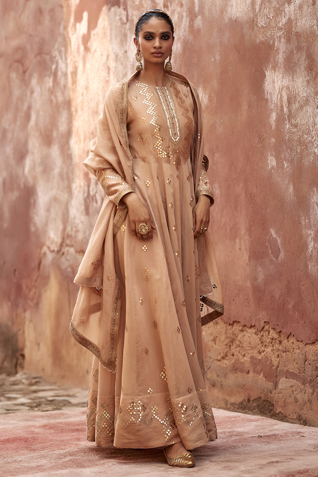 Beige Handloom Chanderi Gota Embroidered Anarkali Set by Avacara at
