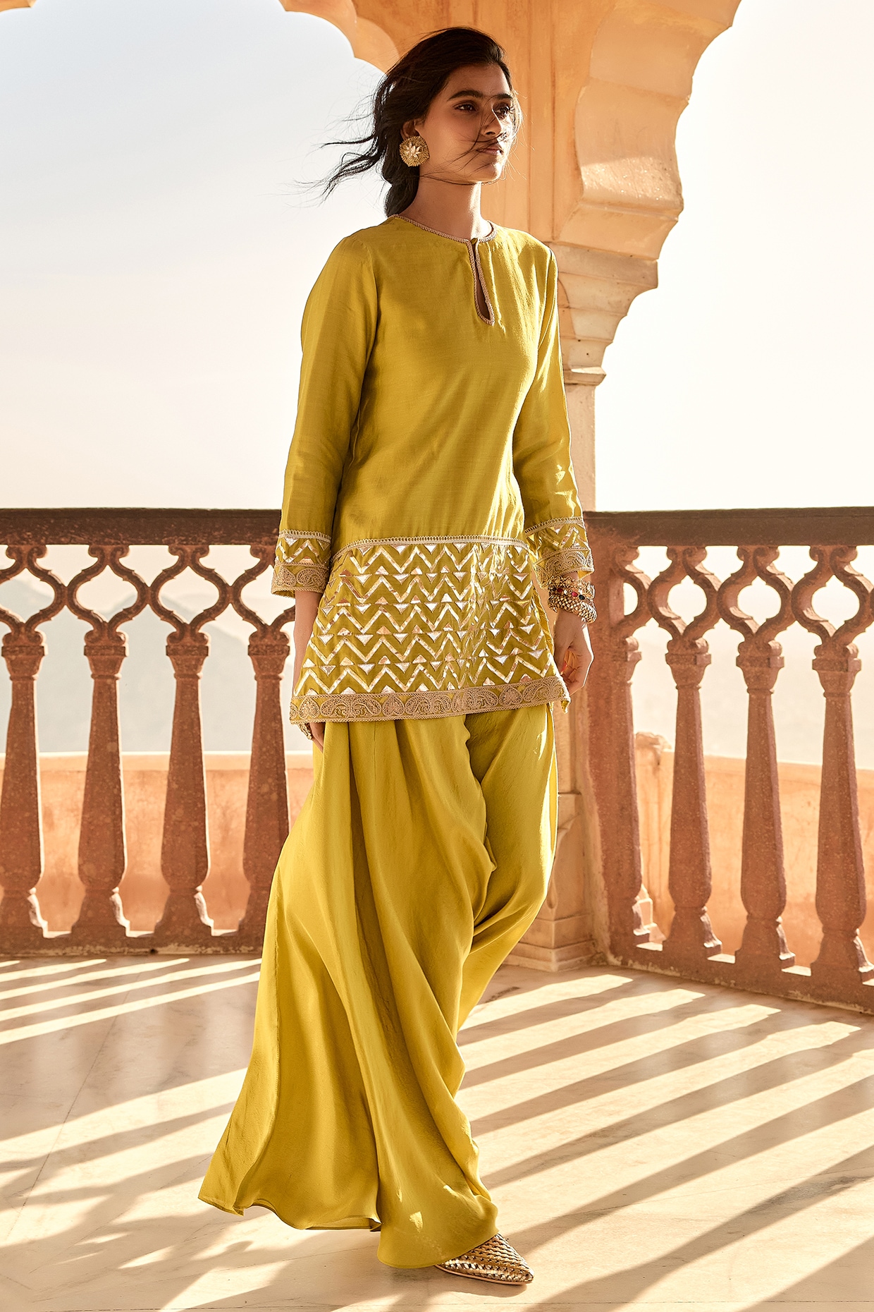 Yellow Handloom Chanderi Dori Embroidered Short Kurta Set by Avacara at